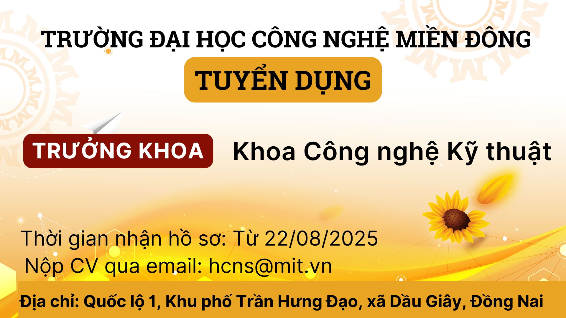 THÔNG TIN TUYỂN DỤNG Vị trí tuyển dụng: Trưởng phòng Đào tạo Đại học Mức lương: Theo thỏa thuận Nơi làm việc: Trường Đại học Công nghệ Miền Đông Địa chỉ: Khu phố Trần Hưng