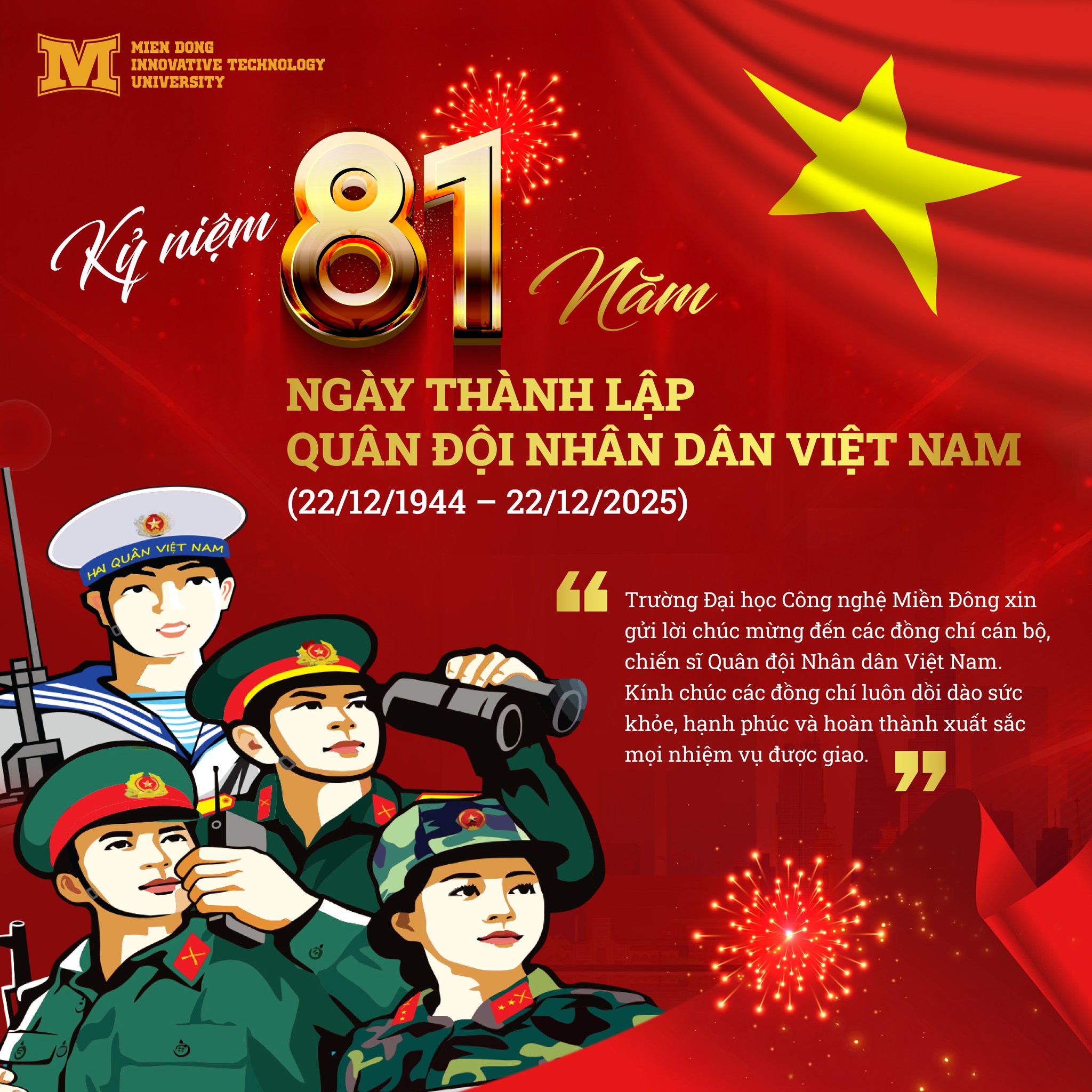 Nhân kỷ niệm 81 năm Ngày thành lập Quân đội Nhân dân Việt Nam (22/12/1944 – 22/12/2025), Trường Đại học Công nghệ Miền Đông (MIT Uni.) xin trân trọng gửi lời tri ân sâu sắc đến các thế hệ cán bộ, chiến sĩ Quân đội Nhân dân Việt Nam – những người đã và đang không ngừng cống hiến vì độc lập, chủ quyền và bình yên của Tổ quốc.