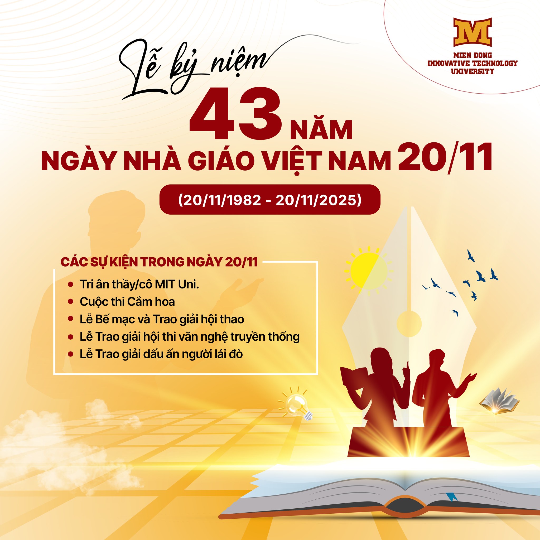 Đây là dịp để toàn thể sinh viên MIT Uni. bày tỏ sự biết ơn đến những người đã tận tâm giảng dạy, hỗ trợ và đồng hành cùng các bạn trên hành trình học tập. Các bạn MITers đừng quên theo dõi lịch, tham gia và cùng tạo nên một ngày 20/11 thật đáng nhớ nhé!