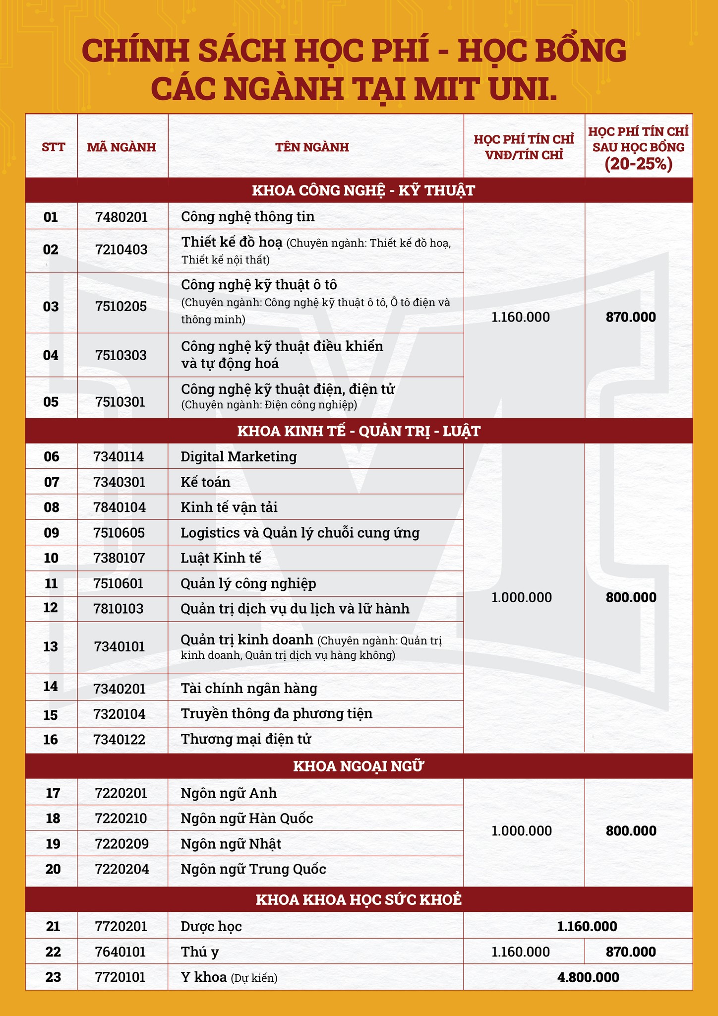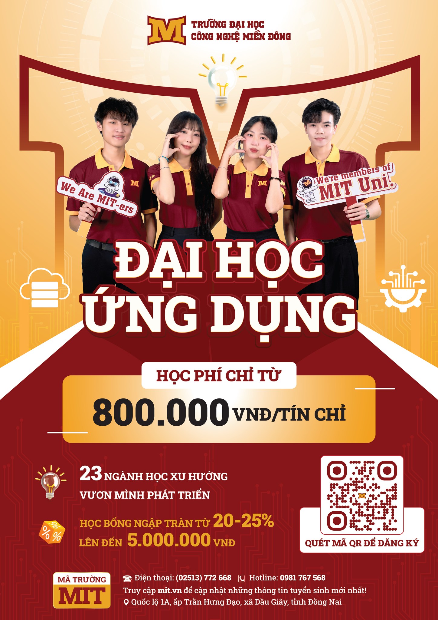 MIT Uni. chính thức công bố tuyển sinh năm 2026 với 23 ngành học xu hướng, đào tạo theo hướng ứng dụng và liên kết chặt chẽ với doanh nghiệp. Học phí chỉ từ 800.000 VNĐ/tín chỉ, công khai, minh bạch và cam kết tăng không quá 8%/năm.